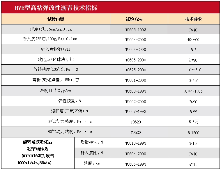 HVE型高粘彈改性瀝青是在SBS改性瀝青基礎(chǔ)上,加入特制的高粘彈改性劑,經(jīng)高溫熔融、剪切、發(fā)育形成的高性能改性瀝青。區(qū)別于普通SBS 改性瀝青, HVE 高粘彈改性瀝青粘度高、彈性恢復(fù)能力好,制備的改性瀝青混合料抗車(chē)轍性能、抗水損害性能以及抗飛散性能優(yōu)異,能夠大幅度增加瀝青路面服役年限。