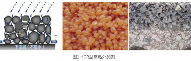 HCR 型高粘外加劑是一種新型直投式瀝青混合料添加劑,通過使用特種聚 合物復(fù)合材料,能夠大幅提升其在瀝青基材料中的分散性及“瀝青-集料”界面 間的粘附性。目前成品高粘瀝青60℃粘度在20000Pa · s~50000Pa · s, 遠(yuǎn)遠(yuǎn)不 能滿足高品質(zhì)排水路面等功能性路面的需求, HCR 型高粘外加劑可以滿足高性能排水路面指標(biāo)要求(60℃動(dòng)力粘度達(dá)到400000Pa · s), 方便施工。