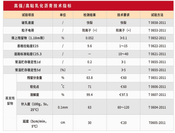 4、技術(shù)優(yōu)勢(shì) ① 粘結(jié)強(qiáng)度高:采用高分子樹(shù)脂復(fù)合改性,粘結(jié)強(qiáng)度遠(yuǎn)大于普通乳化瀝青; ② 瀝青粘度大:改性后瀝青或乳化瀝青蒸發(fā)物的粘度大于50000Pa · s; ③ 乳化點(diǎn)超高:改性后的瀝青或乳化瀝青蒸發(fā)物的軟化點(diǎn)大于70℃; ④ 成膜速度快:特制的樹(shù)脂材料,施工完成后即可開(kāi)放交通; ⑤ 使用壽命長(zhǎng):使用高乳化瀝青預(yù)防性養(yǎng)護(hù)技術(shù)能夠延長(zhǎng)路面使用壽命。
