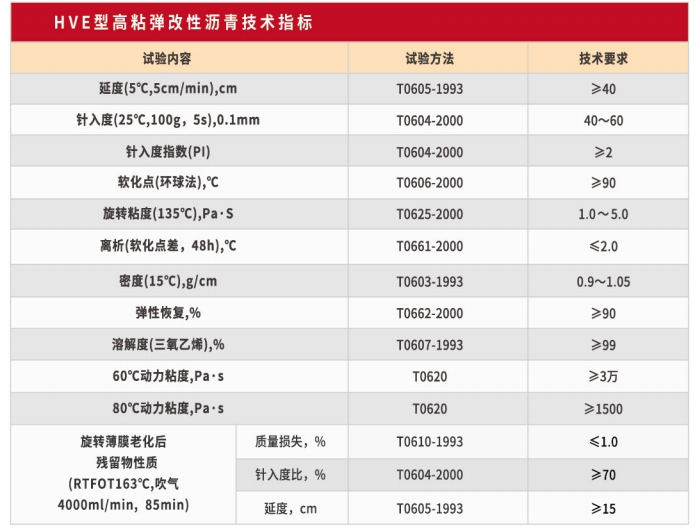 ? ? ? ?HVE型高粘彈改性瀝青是在SBS改性瀝青基礎(chǔ)上,加入特制的高粘彈改性劑,經(jīng)高溫熔融、剪切、發(fā)育形成的高性能改性瀝青。區(qū)別于普通SBS 改性瀝青, HVE 高粘彈改性瀝青粘度高、彈性恢復(fù)能力好,制備的改性瀝青混合料抗